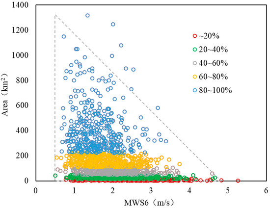 Existing research has confirmed that wind and wind-induced currents provide direct power for the accumulation and dissipation, and horizontal and vertical movement of algal communities, and appropriate wind speeds can promote the formation of algal blooms. However, this does not mean that higher wind speeds are more beneficial to the formation of algal blooms. In fact, the cumulative area and frequency of algal blooms were generally negatively correlated with wind speeds from the results we observed. Figure 8 shows the area of 1973 algal bloom samples in Lake Taihu during 2003–2022 and the corresponding MWS6. As can be seen from the figure, the outer contour of the algal area dots displays an approximate right triangle, indicating that the wind speed corresponding to the algal blooms with larger areas is relatively small. However, it is very obvious that no algal bloom was observed by satellites when MWS6 < 0.5 m/s, indicating that wind speed conditions close to calm were not beneficial for the formation of algal blooms due to lack of external dynamics. By dividing all the algal bloom samples into five equal parts and distinguishing them by different colors, it can be found that most of the algal blooms in Lake Taihu occurred in a small area, of which 60% is less than 108 km2, less than 5% of the surface area of the lake, but its corresponding wind speed range is larger than that of the larger area of algal blooms. Approximately 20% of the algal bloom area did not exceed 15 km2 but corresponded to the maximum wind speed range (0.8–5.3 m/s).