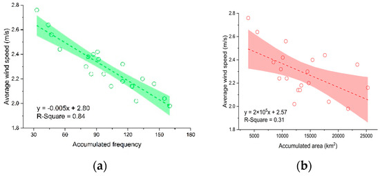 Relationship between yearly mean wind speeds and accumulated frequency (R-Square = 0.84, p < 0.01) (a) and accumulated area (R-Square = 0.31, p < 0.05) (b) of algal blooms in Lake Taihu during 2003–2022. The shadows represent the 95% confidence interval of the linear regression trend line.