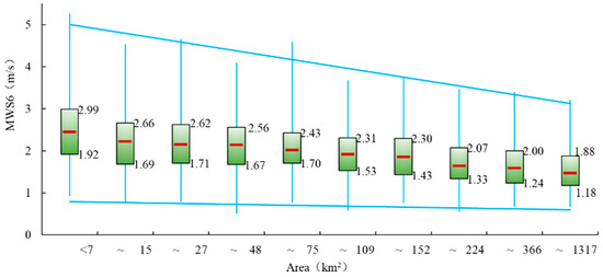 Next, we will discuss the response of different-scale algal blooms to wind speed. We arranged 1973 algal bloom samples in ascending order of area size and divided them into 10 sub-intervals with equal sample number and obtained the area range of algal blooms in each sub-interval as 0–7, 8–15, 16–27, 28–48, 49–75, 76–109, 110–152, 153–224, 225–366, and 367–1317 km2, respectively. The maximum, minimum, median, upper quartile, and lower quartile of MWS6 within each sub-interval were calculated and represented in the boxplot (Figure 10). We can find that as the area increased, the maximum wind speed in the sub-interval showed a significant downward trend, while the minimum wind speed slowly declined, and the fluctuation ranges generally showed a narrowing trend. The wind speed ranges corresponding to the upper and lower quartiles of wind speeds also narrowed as the area increased. The upper quartile wind speeds decreased from 2.99 m/s, corresponding to the minimum area sub-interval, to 1.88m/s, corresponding to the maximum area sub-interval, by 37.1%. The lower quartile wind speeds declined from 1.92 m/s to 1.18 m/s as the area increased by 38.5%, and the difference in box wind speed decreased from 1.11 m/s to 0.7 m/s, by 36.9%.