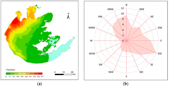 The wind direction mainly affects the distribution pattern of algal blooms in the entire lake by regulating the transport direction of nutrients within the lake and the movement direction of surface algal blooms. Figure 12 shows the spatial distribution pattern of algal bloom frequency in Lake Taihu and the wind rose diagram of the region in the past 20 years. We found that the spatial distribution pattern of algal blooms in the lake presented an obvious gradient structure, with the highest frequency of algal blooms appearing in the northwest near-shore waters and gradually decreasing towards the southeast Lake Taihu (Figure 12a). It is particularly interesting to find from the wind rose (Figure 12b) that the dominant wind direction in the Lake Taihu area for decades was southeast. The location with the highest frequency of algal blooms precisely corresponded to the downwind direction of the dominant wind direction. Therefore, this may be a reasonable explanation, that is, under the continuous power provided by the perennial southeast winds throughout the year, algal colonies continue to move towards the northwest direction, accumulating and forming algal blooms as they approach the lake shore. Moreover, the long-term effects of such wind fields may lead to a vicious circle of water-quality decline and algae outbreaks. Under the influences of prevailing winds, nutrients in the lake continued to accumulate in the northwest waters, leading to a continuous decline in the water quality, making these waters more prone to algal blooms than other areas. At the same time, more algal blooms died and decayed, causing a deterioration of water quality in this area. In fact, the northwest waters of Lake Taihu have always been the part with the worst water quality over the past decades [54].