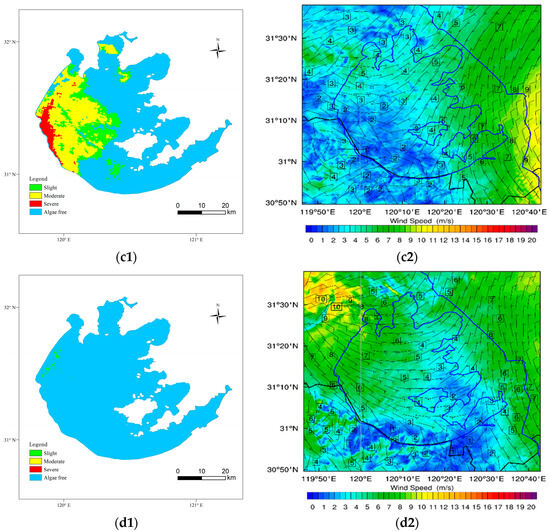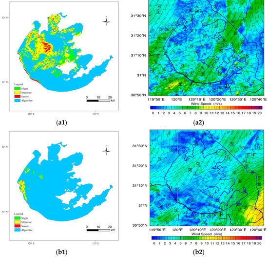 Figure 13 displays the algae bloom intensity interpreted from satellite images on 4–7 September 2010 and the adjacent time wind field near the lake surface simulated by WRF3.8.1. From the intensity map at 13:00 on September 4 (Figure 13(a1)), we can see that the algal blooms covered most of the waters in the middle and north of Lake Taihu, and the areas with greater intensity were concentrated in the waters of the center and north lake, reaching a moderate to severe level. In the simulated wind field map at its adjacent time (Figure 13(b1)), the average wind speeds of the waters where algae blooms occur were less than 3 m/s, significantly lower than those of 4–6 m/s of other waters, with a wind direction of northeast. In the simulated wind field map at 9:00 on 5 September (Figure 13(b2)), the MWS in the waters where algal blooms appeared the previous day increased, with only the southwest coastal waters experiencing lower wind speeds. Correspondingly, only a small area of algal blooms could be seen in the remote sensing map at 10:00 (Figure 13(a2)), which was blown by northeast winds and drifted to the western coastal waters. In the maps at 9:00 on 6 September (Figure 13(c1,c2)), the wind speeds in the northeast of the lake increased to more than 4 m/s, and those in the southwest were significantly lower. It seems very “magical” that a large area of algal blooms has resurfaced in these waters with relatively low wind speeds. The algal bloom intensity was generally above medium, and at a severe level in nearshore waters due to accumulation. At around 10:00 on 7 September, the wind speed significantly increased, with wind speeds exceeding 4 m/s in most waters, and the algal blooms almost disappeared (Figure 13(d1,d2)). This 4-day example of the “growth and disappearance” process of algal blooms provided a good explanation of how the near-surface wind field affected the movement of algal blooms, thereby affecting their spatial distribution pattern.