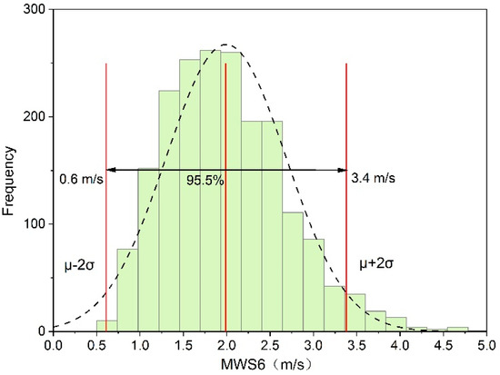 By dividing the MWS6 range (0.5–5.3 m/s) corresponding to 1973 algal bloom samples into 20 equal parts, we obtained the cumulative frequency of every sub-interval as shown in Figure 14. Here, the frequency of four MWS6 sub-intervals exceeded 200, each accounting for more than 10% with a cumulative proportion of 50.7%, and four exceeded 100, accounting for 5.6–9.9% with a cumulative proportion of 33.1%. This indicated that the four sub-intervals with the highest frequency proportion were the most suitable wind speed range for the formation of algal blooms, corresponding to MWS6 ranges of 1.2~2.2 m/s. And 83.8% of algal blooms occurred within the MWS6 range of 1.0~2.9 m/s, which was a suitable wind speed range for the formation of algal blooms. Furthermore, we can find that the frequency histogram of MWS6 approximately exhibited a Gaussian distribution with an average value of 2.0 m/s, and a 95.5% confidence interval of (0.6 m/s, 3.4 m/s). On the basis of this result, it was reasonable that the MWS6 of 0.6 m/s and 3.4 m/s are identified to be the lower and upper critical wind speed indicators suitable for the formation of algal blooms, respectively. The upper limit wind speed of this critical interval is basically consistent with the 3 m/s wind speed estimated by the algae migration model [55,56], which forms, in another sense, mutual corroboration.