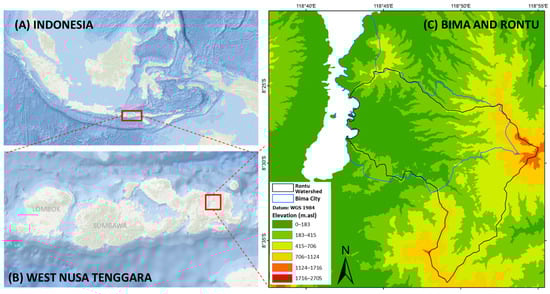 Study area of the research: (A) Indonesia; (B) West Nusa Tenggara Province; (C) Location of Bima City and Rontu Watershed.