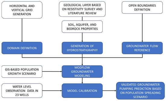 This research evaluates the impact of the population growth of Bima City on groundwater availability through modeling, especially in the amount of pumping in the region. The general flowchart of the study is presented in Figure 2. The modeling started with a domain definition, i.e., the boundaries of the model and the horizontal and vertical grid generation. The modeling was then continued by inputting the geological or hydrostratigraphy layers based on secondary and primarily collected datasets. The primary datasets include field-surveyed hydraulic conductivity data and well-depth data for model calibration. The groundwater modeling used the MODFLOW model with the aid of ModelMuse GUI for conceptualization, data input, and execution [18]. Other secondary datasets involved were the geological map dataset from the Geological Agency of the Republic of Indonesia and population density sourced from Statistics Indonesia (Badan Pusat Statistik, henceforth BPS). These two datasets were used for data cross-checking.