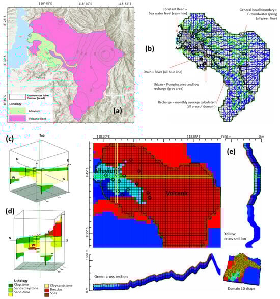 (a) The study area mainly consisted of two lithology types: alluvium on the western lowland and volcanic on the eastern highland. The contours present observed groundwater table elevation in meters above sea level (m.asl). (b) Model boundary conditions, including the treatment of streams and rivers, assumed as drains or gaining streams, constant head at sea boundary, general head boundaries, urban pumping, and recharge areas. (c) Hydrostratigraphy of the alluvium study area consists of soil clay and sandy aquifer. (d) Hydrostratigraphy of the volcanic area comprises volcanic soil and underlying volcanic rocks. (e) ModelMuse interface showing plan, section, and domain views of the aquifer properties assigned to the conceptual model based on volcanic and alluvium lithology properties. The black diamond blocks are the locations of calibration points used in the model calibration.