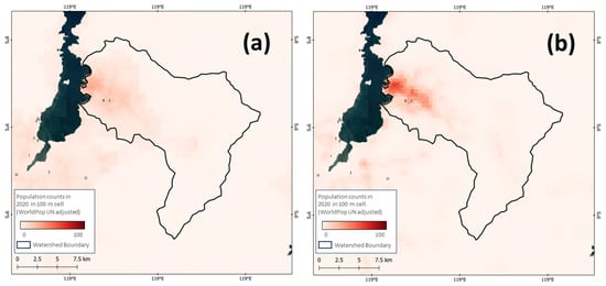 Population counts in 100 m grid cell for 2010 (a) and 2020 (b) based on the Worldpop data.