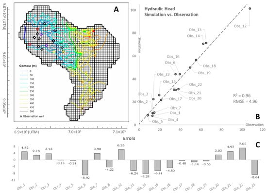 The groundwater model was calibrated using observation data distributed at different population densities and lithologies to test the sensitivity of the parameters (Figure 5C). The calibration gave a result with an RMSE value of 4.9 m and a coefficient of determination of 0.96 (R2 = 0.96). The maximum residual difference was between 7.7 m and −7.9 m (Figure 6B), found in observation wells in volcanic areas. This finding may be caused by the complex condition of volcanic units by mixing lava and pyroclastic, as well as steep morphological conditions that may not be accommodated by the 400 × 400 m grid size. The calibration process gives K values ranging from 5 × 10−4 to 2 × 10−5 m/s for aquifers and from 1 × 10−7 to 1 × 10−9 m/s for bedrock. MODFLOW based on finite difference has limitations on conditions that vary in k (hydraulic conductivity) value and topography, but providing regional conditions is quite good [38].