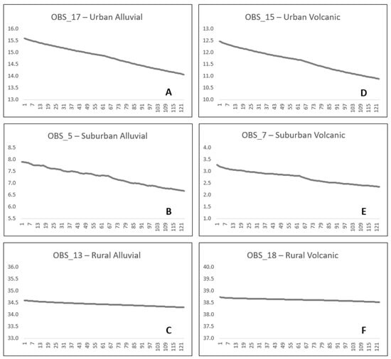 Groundwater drawdown characteristics based on population density and geology type: (A) urban alluvial, (B) sub-urban alluvial, (C) rural alluvial, (D) urban volcanic, (E) sub-urban volcanic, and (F) rural volcanic. The x-axes are timesteps in month and the y-axes are groundwater elevation in meter.