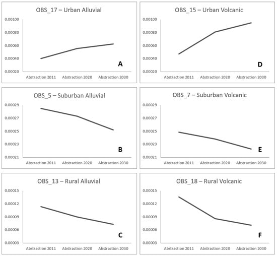 Groundwater abstraction growth characteristics based on population density and geology types: (A) urban Alluvial, (B) sub-urban alluvial, (C) rural alluvial, (D) urban volcanic, (E) sub-urban volcanic, and (F) rural volcanic. The y-axes are groundwater abstractions in m3/s.