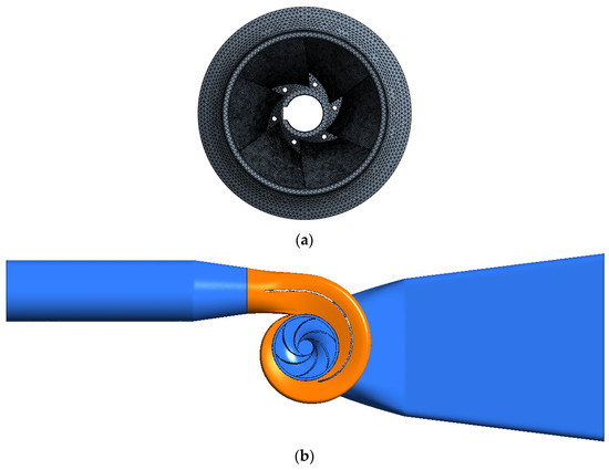 Computational domain. (a) Finite element model of impeller; (b) Fluid domain.