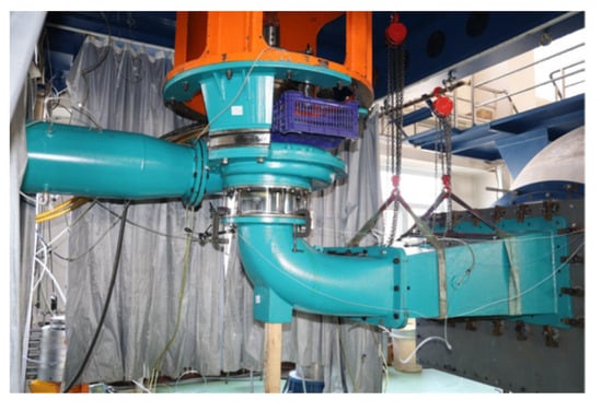The test was conducted at the China Institute of Water Resources and Hydropower Research test rig, as shown in Figure 3. The maximum test head of the test bench is 150 m, the maximum flow rate is 2.2 m3/s, and the efficiency measurement uncertainty is less than ±0.2%. The test bench is equipped with a hydraulic mechanical energy performance test.