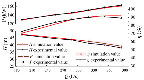 Figure 4 compares the calculated and experimental values of the energy characteristic parameters under each working condition. Under the design conditions, the calculated value is more accurate in predicting the head, and the calculated value exceeds the experimental one. The shaft power value obtained through calculation is 0.65 percent greater than that of another value, while the calculated efficiency value is 0.14 percentage points lower than the experimental value. In the case of a low flowrate, the computed values of head, shaft power, and efficiency exhibit a decrease. In the case of a large flowrate, the computed values of head and power exceed the experimental values, while the calculated value of efficiency falls short of the experimental value. Overall, the errors are all within 5%, and the numerical calculation has high reliability.