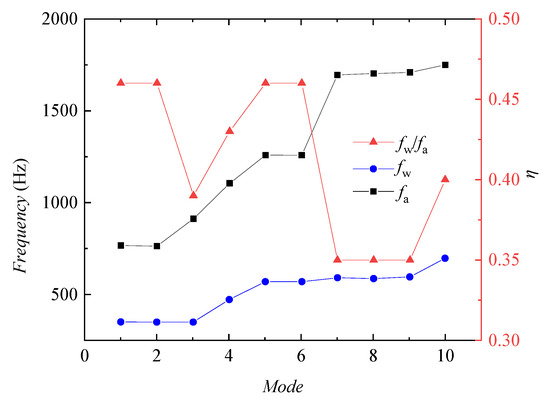 Figure 5 shows the graphs of the first 10 orders of the intrinsic frequency of the impeller in air and water, and Table 2 shows the comparison of the first 10 orders of the intrinsic frequency of the impeller. Where fa denotes the intrinsic frequency in air, fw denotes the intrinsic frequency in water, and η = fw/fa denotes the effect of the water body on the intrinsic frequency of the impeller.