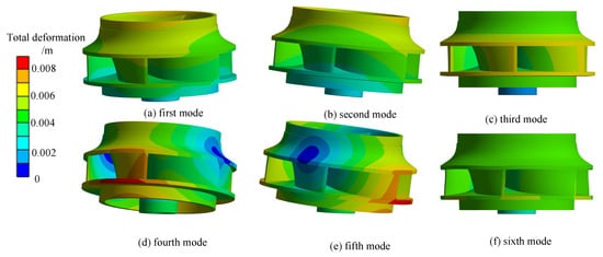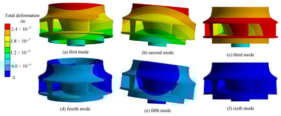 Figure 6 and Figure 7 show the displacement and vibration patterns of each order mode of the impeller in air and water, respectively. The figures show that the displacements and vibration patterns of each order mode of the impeller in water and air are very similar, with the maximum displacements occurring at the outlet of the impeller rear cover plate. The intrinsic frequencies and vibration patterns of the impeller in air and water usually appear in pairs, mainly due to the periodical symmetric structure of the impeller. The 1st and 2nd order vibration pattern are shown as the impeller with the z-axis as the center point, up and down vibration in the axial plane; the 3rd and 4th order vibration pattern is shown as the torsional vibration of the impeller around the z-axis; and the 5th and 6th order vibration pattern is shown as the unilateral bending deformation of the impeller in the axial plane. The impeller’s intrinsic frequency in water is lower than its intrinsic frequency in air due to the extra mass of the water body, but the reduction of the intrinsic frequency of each order is different, as shown in the influence factor, is fluctuating between 0.35 and 0.46.