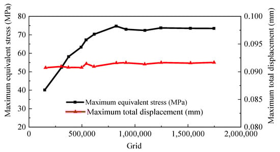 This work aims to mitigate the impact of mesh quantity on the structural field calculation of the impeller. To achieve this, the mesh division is conducted using varying numbers, and the static stress calculation of the impeller is carried out for a certain same working condition (Q = 900 m3/h). In order to facilitate observation, Figure 8 illustrates the relationship between the static stress and deformation values at various mesh counts. It is evident that the number of meshes employed in the impeller design has a negligible impact on the deformation. Additionally, the maximum equivalent stress variation stabilizes as the number of meshes reaches 1,600,000, and considering the computational efficiency, this research utilizes a mesh count of 1,600,000 to conduct computations and analyze static stresses on the impeller.