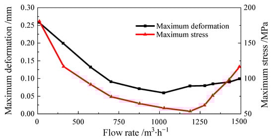 Calculation results show that, as the flow rate increases, the impeller undergoes variations in both maximum equivalent stress and deformation. Initially, these values decrease and then increase, reaching their minimum near the design condition point. The impeller exhibits its highest stress and deformation levels under low flow conditions, particularly at zero flow where the maximum equivalent stress reaches 181 MPa and the maximum total deformation is 0.26 mm. To guarantee the secure and dependable operation of the pump and pumping station system, centrifugal pumps should be avoided to operate under 0–0.2 Q flow conditions. The impeller undergoes its most significant distortion at the exit of the rear cover plate. The maximum equivalent stress of the impeller occurs at the corner where the outlet edge of the back of the blade intersects with the front cover plate of the impeller. There is a significant stress concentration in the middle of the inlet edge of the blade and at the junction with the front and rear cover plates.
