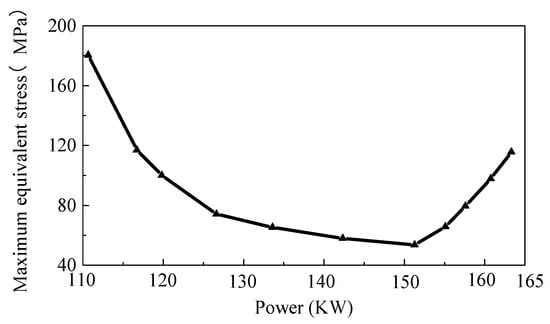The graphical representation in Figure 10 illustrates the correlation between the maximum equivalent force and the shaft power at each different operating condition. With the increase of shaft power, the observed trend in the maximum equivalent force exerted by the impeller exhibits a pattern of initial decrease followed by subsequent increase. After the design condition point, the maximum equivalent force of the impeller shows an approximately linear relationship with the power, which indicates that at this point, the maximum equivalent force is related to the torque.