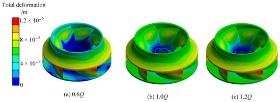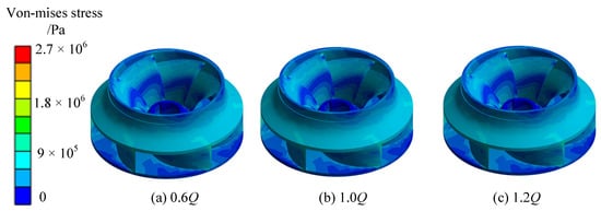 Figure 11 and Figure 12 show the displacement and deformation distribution and equivalent force diagrams under three typical conditions, respectively. Through observation, the maximum deformations all occur at the outer edge of the back cover plate outlet, which is because the impeller has a lower stiffness here and the fluid pressure here is higher, and stiffness damage is easy to occur in these places. The impeller experiences its highest equivalent stresses at the curved corner where the intersection of the back exit edge of the blade and the front cover plate takes place, as shown in Figure 11. Here the blade outlet pressure is higher, and here the thickness is thin, and it is also the intersection round corner of the front cover plate and the blade, which makes it easy to produce stress concentration. Significant stress concentrations are seen near the midpoint of the intake side of the blade, as well as at the junction where the blade intersects with both the front and rear cover plates.