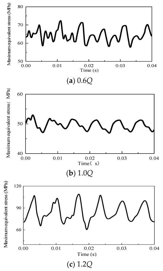 The rated rotational speed of the centrifugal pump is n = 1450 r/min, and the rotational period is T = 0.04 s. To conduct an analysis of the stress experienced by the impeller at various time points throughout a rotational cycle, the structural field and the impeller field of the centrifugal pump are rotated sequentially by 5° until the end of the rotational period (360°), and, at the same time, the positional relationship between the vane and the tongue of the volute will likewise undergo alteration. The results of the rotated flow field are sequentially loaded into the corresponding impeller structure field, and the stresses of the impeller at different moments are calculated. Figure 13 illustrates the temporal distribution of the greatest equivalent stresses experienced by the impeller during three representative operational scenarios at different moments in one rotation cycle (T = 0.04 s). It can be seen that, under each condition, the stress experienced at the maximum stress point of the impeller during one rotation cycle exhibits a cyclic pattern, characterized by six peaks and valleys. This discovery is consistent with the relationship between the number of impeller blades and the frequency of maximum stress, indicating that both the number of impeller blades and the rotational speed have a significant influence on the frequency of maximum stress. Furthermore, it is evident that the maximum equivalent stress amplitude significantly increases when subjected to high flow rates. The periodic variations in the internal flow field characteristics of a centrifugal pump are caused by the dynamic and static interference between the impeller and the volute casing, as well as the changing relative positions of the impeller blades and the volute tongue. Consequently, these factors also impact the distribution of equivalent forces acting on the impeller. Although the maximum stress is very small compared with the ultimate destructive stress of the material, it is necessary to prevent the fatigue damage of the vane because its change shows periodicity.