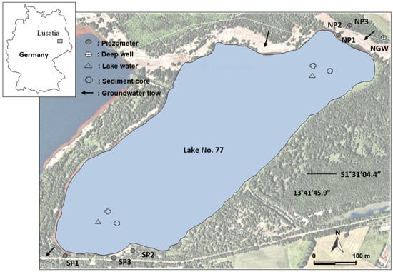 The study site, Lake 77 (~0.25 km2, max depth ~7 m), is located in the Lusatia region in the east of Germany, about 100 km south of Berlin (Figure 1). The lake was a post-mining pit turned into a lake when dewatering ceased, and the original groundwater level was established. The lake is fed by the groundwater and is marked by high loads of iron, sulfate, and acidity [14].