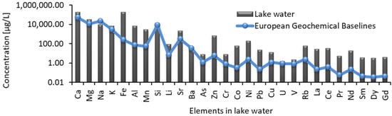 Dissolved elements in lake water as compared with European geochemical baselines [25] of various elements in stream waters.