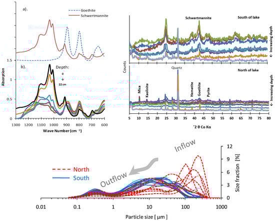 Particle size distribution of lake sediments. Arrow indicates the water flow direction from the north to the south direction of the lake. X-ray diffractograms of the sediment sample from the north and the south sampling locations of the lake show significant differences in sediment mineralogy. The FTIR spectra of (a) goethite and schwertmannite standards and (b) sediment samples. Note the transformation of schwertmannite to goethite with the depth of lake sediments.