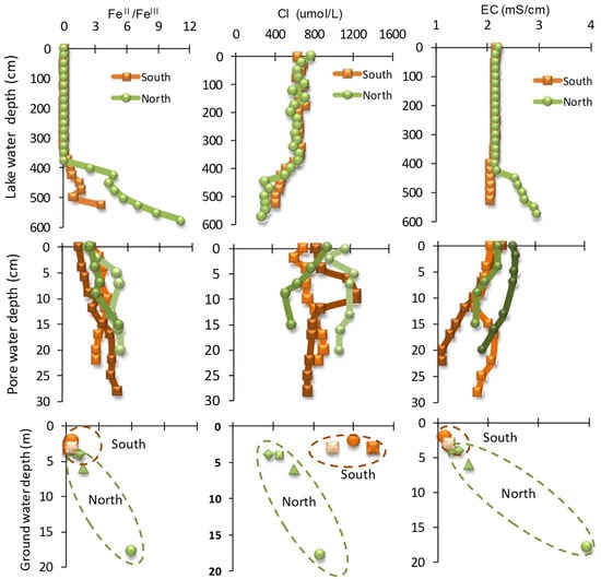 Vertical changes of Fe II/FeIII, Cl, and EC values in lake water, porewater, and groundwater from the north and south sampling locations.