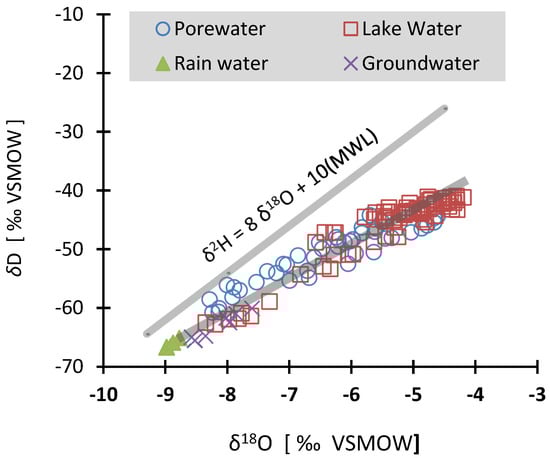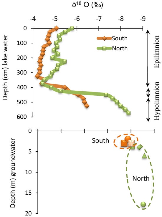 Plot of δD vs. δ18O of lake surface water, porewater, groundwater, and local rainwater relative to the global meteoric water line (MWL; Craig [36]). Changes in δ18O values with the depth of lake water and groundwater. Note the δ18O values have a shift of about 1‰ in the epilimnion and about 2‰ in the hypolimnion from north to south (~800 m apart).