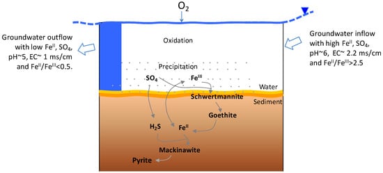 A simplified conceptual geochemical model Is depicted in Figure 6. In the northern part of the recharge area, overburden mixed with excavated waste material, which was transported and moved around during the mining of lignite beds in the past, now forms a ‘dump aquifer’. Over time pyrite weathering products are stored in porewater or as secondary mineral phases. The rain and snowmelt water infiltrating the dump aquifer carry oxidation products (e.g., FeII, Ca2+, H+, SO42−) to the groundwater which enters the lake as subsurface inflow. The groundwater from the northern aquifer showed 1.9 times higher EC values as compared to the groundwater from the south (lake outflow). Dissolved FeTotal and SO4 showed a significant reduction in concentrations, 6.7 and 3.4 times, respectively, from the north to the south groundwater along the flow path (<1 km apart). The difference in concentration of 7030 umol/L of FeTotal and 10,225 umol/L of SO4 is retained in the lake as solid products. High surface area and reactivity of amorphous phases also act as a scavenger of dissolved elements further decreasing EC values. Schwertmannite is a great sorbent for trace metals in AMD systems but metal sorption is highly pH dependent for many metals including Pb and As around 4 to 5 pH values, and Cu, Zn, and Cd around circumneutral conditions [6]. Reduction in a dissolved load indicated that the lake naturally works as a mini treatment plant that improves water quality downstream. Since the conditions are favorable for schwertmannite formation, the solid phase can be used as a product of commercial value. The thickness of lake sediment cores and the percentage of fine particles (size < 50 µm) in samples from the south sampling location were measured to be higher than the north, pointing to a higher sedimentation rate. It is, therefore, likely that the lake’s depth will reduce faster in the south as compared to the north over time. The higher fine particle size fraction and XRD analysis also supported a high percentage of fine-size amorphous materials.