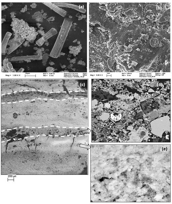 SEM images of diatoms (a), weathered lignite (b), and layers (c) with a mixture of minerals as a dark band (d) and Fe-(hydr)oxide (e).