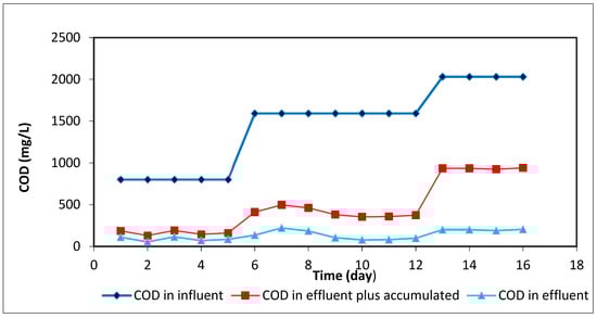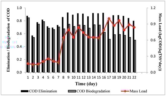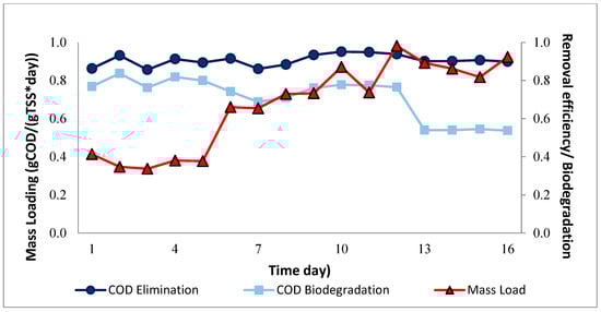 | Operation Days, Balance Included | Oil Mass Fed (g) | Oil Mass Retained (g) | Oil Mass in Effluent (g) | Oil Mass Accumulated (g) | Biodegraded Mass (g) | Biodegradation Efficiency (%) |