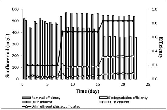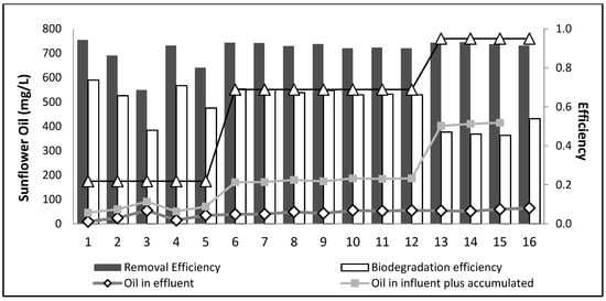 | Operation Days, Balance Included | Oil Mass Feeding (G) | Oil Mass Retained (G) | Oil Mass in Effluent (G) | Oil Mass Accumulated (G) | Biodegraded Mass (G) | Biodegradation Efficiency (%) |