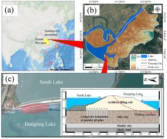Location map of the Nanhu embankment in Hunan province, China. (a) Map of China’s administrative boundaries overlaying the shaded relief map. (b) Map of administrative boundaries of Yueyang City; the red line is the study area. (c) Location of Nanhu embankment in the study area.