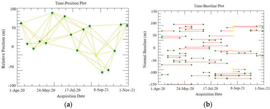 The small baselines subset InSAR (SBAS-InSAR) technique with the weighted least squares estimation method was adopted to obtain the high precision time-series deformation based on the coherent targets with high coherence [,] because it has good adaptability in countryside vegetation areas []. One image was selected as the primary image from N + 1 images. Other images were registered to the primary image and the spatial and temporal baseline maps were drawn (Figure 2). Then, SBAS-InSAR created M interferences. M must be met to the following formula []: