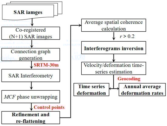 The external DEM data and precise orbit ephemerides data were adopted to conduct the geometry co-registration for each image. The temporal and spatial baselines of each interferogram pairs were calculated via SBAS-InSAR technology. The time interval for each interferogram pair (temporal baselines) and the space distance of the satellite at different shooting times (spatial baselines) were observed and the spatial and temporal baseline plots were then created (Figure 2). Then, the Goldstein filter and minimum cost flow (MCF) phase unwrapping were performed to obtain a series of unwrapped differential interferograms []. The ground control points (GCPs) were selected for refinement and re-flattening to remove the residual constant phase and residual phase ramp, which were used to improve the accuracy of deformation monitoring. The unwrapping coherence threshold was set as 0.2 to mask pixels with coherence less than this threshold. Finally, the deformation velocity was obtained after the interferogram inversion and geocoding procedure. The flow chart of SBAS-InSAR used in this work is presented in Figure 3.