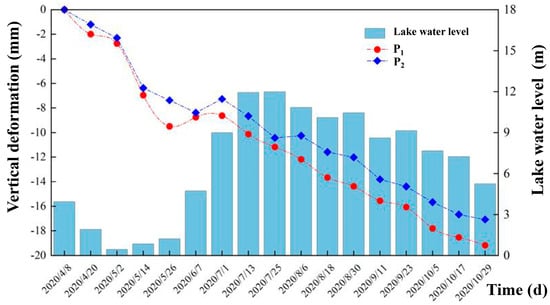 Deformation was an inevitable process in the service life of the railway embankment, which was often aggravated by rapid drawdown and train loading. The time series analysis of the railway embankment deformation helped to discern whether the settlement was normal or abnormal. To understand the movement trend, the vertical settlement time series of two sites (Location P1 and P2) in section A was displayed. It was noted that the deformation of the railway embankments was not obvious when the water level rose (from 26 May 2020 to 1 July 2020) (Figure 5). Therefore, the period (13 July 2020 to 29 October 2020) from the initial creep to the embankment pre-failure during the rapid drawdown was focused on, with the cumulative displacement being obtained via the SBAS-InSAR method. However, the process from critical failure to collapse of the embankment was a relatively short period: 1 November to 6 November. This time was in the period between two satellites returning to the same position. Thus, when the phenomenon of train shaking was perceived by the train driver at 8:20 on 1 November, the precise level was used to monitor the deformation in this period until the embankment collapsed.