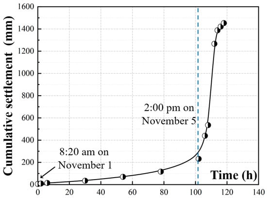 Creep deformation of the embankment did not affect driving comfort before 8:20 on 1 November. The phenomenon of train shaking was first perceived by the train driver. Subsequently, the deformation was continuously monitored using the precise level (per 2 h) until the embankment collapsed. The observation point was near to site P1. As shown in Figure 6, the large deformation began at 8:20 on 1 November and gradually escalated until the full sliding of the embankment (positive value indicates accumulated settlement). The deformation was 35 mm within 30 h after 8:20 on 1 November, which exceeded the cumulative deformation during the creep process from 13 July 2020 to 29 October 2020. The deformation increased sharply at 2:00 p.m. on 4 November (after 102 h), being 232 mm. This embankment was closed to traffic at this time due to the excessive subsidence. Finally, the cumulative subsidence of the embankment reached more than 1400 mm within the following 16 h, and the rate of deformation increased abruptly.