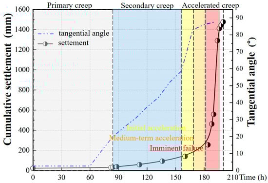 The cumulative settlement-time and tangential angle-time curve in various phases of embankment failure.