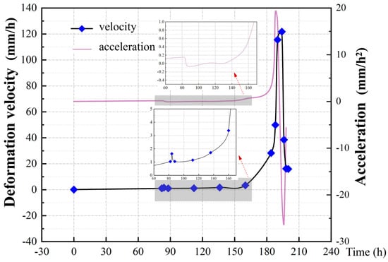 The macroscopic deformation of the embankment failure was recorded via SBAS-InSAR and leveling during the rapid drawdown. The creep process was very long (108 days, 13 July 2020 to 29 October 2020) and the rapid deformation process was relatively short. To clearly describe the deformation-time law, the deformation trend was concerned before embankment failure from 29 October to 6 November 2020 (within 200 h) (Figure 7). The velocity-time and acceleration-time history were obtained via differential calculation of the measured displacement data (Figure 8). In addition, a tangential angle-time curve was calculated to confirm the sub-stage in the accelerated deformation stage via drawing a T-t (relative time T-monitoring time t) [] in Figure 7. The formula is expressed as follows: