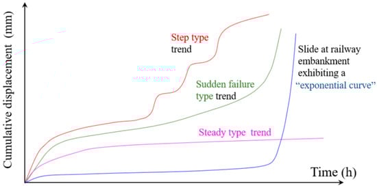 Figure 9 displays the difference in deformation patterns between various slopes. Steady type: the accumulated displacement changes slowly and remains stable, such as a gentle slope with a higher safety margin. The slope is still in a stable state under the natural conditions. However, this type of slope easily loses stability and sliding is affected by external adverse factors. Lianziya landslide presents this deformation pattern due to the impact of changes in reservoir water level []. Step type: this type of slope is affected by a cyclical adverse factor. For example, the deformation pattern of landslides always exhibits a step-like rise trend due to the fluctuation of the reservoir water level in the Three Gorges region [,]. Sudden failure type: the accumulated displacement-time curve shows a trend that the deformation rate is gradually increasing, also termed “Saito law.” The sudden failure means a very short time for landslide collapse after entering the accelerated creep phase. For example, the failures at the Waco Dam, Carsington Dam, and the Xintan landslide show this deformation pattern from the creep to the final failure under the influence of changes in the reservoir water level [,]. However, the deformation curve of the railway embankment shows an exponential curve, which tends to increase nonlinearly. It was concluded that the time of the secondary creep phase at the railway embankment was shortened. Furthermore, the train loading aggravated the failure process of the embankment, leading to a short time from abnormal deformation to embankment sliding. Because the train to work has a high requirement for the settlement of the embankment, the large deformation of the embankment may lead to a traffic accident. Thus, only the correct interpretation of deformation behavior for the railway embankment can improve the response time of safety decisions or recovery.