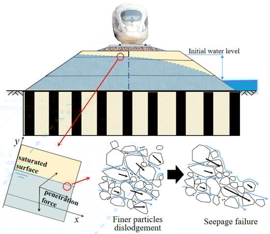 Many soil slope failure accidents during rapid drawdown have been widely reported. For example, in the United States, 30% of landslides occurred under rapid drawdown conditions in Roosevelt Lake from 1941 to 1953 []. The same was encountered in Japan. The drawdown of the reservoir caused ~60% of landslides in recorded events []. In China, the discharge of the Three Gorges Reservoir triggered group-occurring landslides, which encouraged people and local governments to pay attention to the failure mechanism of these reservoir-induced landslides []. Some researchers have begun to pay attention to the failure mechanism of soil structure under seepage [,]. Unlike most landslides or dams, the deformation of railway embankments is exacerbated under the additional stress of train loading and the permeation effect []. Therefore, this work aimed to interpret the unique mechanism of embankment failure considering the coupling of seepage and stress.