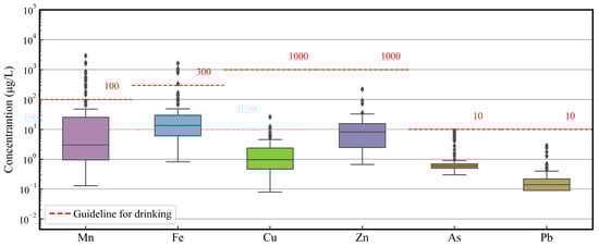 The statistical results were presented in Table 4 and Figure 2, respectively. The pH exhibited a range of 6.81 to 8.63. The mean concentrations of trace elements, in descending order, were as follows: Mn (109.46 μg/L) > Fe (70.09 μg/L) > Zn (12.83 μg/L) > Cu (2.12 μg/L) > As (1.51 μg/L) > Pb (0.24 μg/L). Notably, 13.16% and 5.26% of groundwater samples exceeded the Chinese drinking water guidelines for Mn (n = 15) and Fe (n = 6), respectively. Furthermore, Mn and Fe exhibited high coefficients of variation (CV), suggesting that their concentrations were influenced by abnormal human activities or specific geological settings.