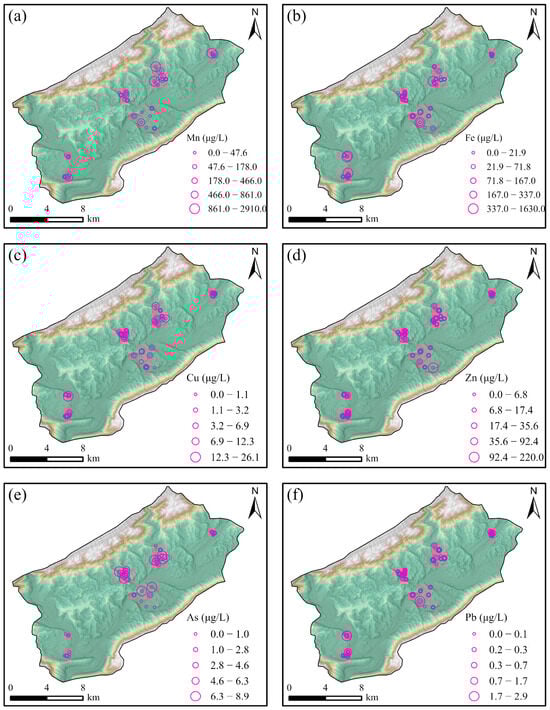 The distribution and concentration of trace elements in the study area. The spatial distribution of concentration for (a) Mn, (b) Fe, (c) Cu, (d) Zn, (e) As, and (f) Pb.