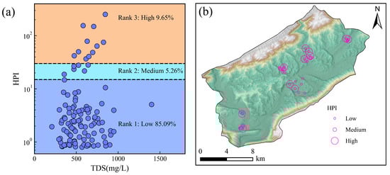 The heavy pollution index of trace elements in the study area. (a) HPI vs. TDS (b) Spatial distribution of the HPI values.