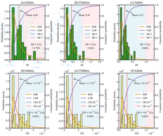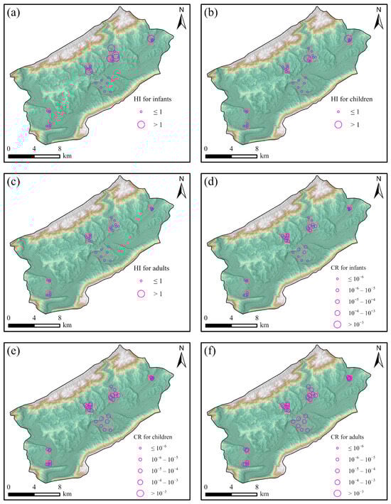 The distribution of HI and CR for infants, children, and adults in the study area. The distribution of (a) HI for infants, (b) HI for children, (c) HI for adults, (d) HI for infants, (e) CR for children, and (f) CR for adults.