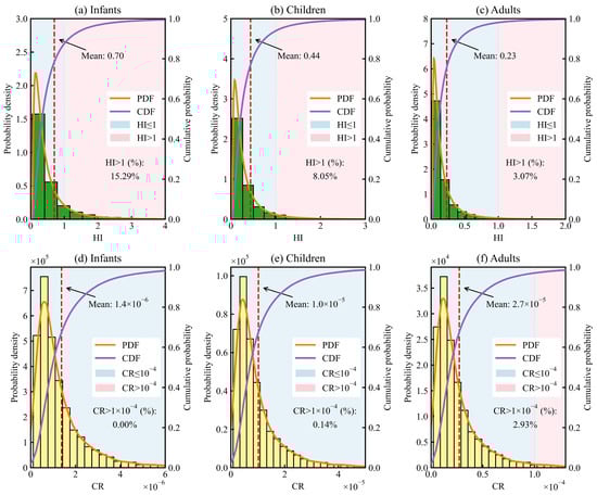 Cumulative permeability and probability density of HI and CR for infants, children, and adults based on Monte Carlo simulation. (a) HI for infants, (b) HI for children, (c) HI for adults, (d) HI for infants, (e) CR for children, and (f) CR for adults.
