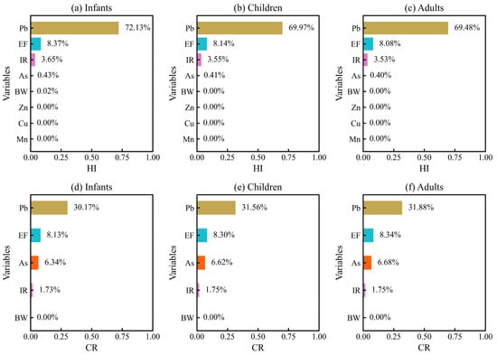 Sensitivity analysis of HI and CR for infants, children, and adults. (a) HI for infants, (b) HI for children, (c) HI for adults, (d) HI for infants, (e) CR for children, and (f) CR for adults.