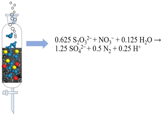 Reduced sulfur (sulfide, sulfur monomers, thiosulfate, etc.) is a typical and cheap electron donor, and the by-products (including sulfate) produced during denitrification are less harmful than secondary pollution [10]. Currently, sulfur monomers are one of the most commonly used electron donors today, but alkalinity depletion can lead to a significant drop in pH, which inhibits the process, requiring either an external base or an increase in alkalinity in the filler to balance the pH, resulting in increased effluent hardness [11]. Due to its high water solubility, non-toxicity, and non-inhibitory properties, thiosulfate is more easily utilized in biological oxidation compared to sulfide and sulfur monomers, and is commonly used in the cultivation of sulfur autotrophic denitrifying microorganisms for their enrichment. The use of thiosulfate as an electron donor facilitates the rapid start-up of the biochemical system, which is able to minimize the production of sludge, and significantly reduces the energy consumption for sludge post-treatment and the emission of greenhouse gases [12]. Trouve et al. [13] compared the rate of NO3−-N reduction by Thiobacillus denitrificans using FeS, S2O32−, FeS2, and S. The autotrophic denitrification reaction rates of the four substrates decreased in the following order: S2O32− > FeS > FeS2 > S.