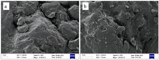 To analyze the chemical composition of the magnetic pyrite, a scanning electron microscope (SEM) and an energy-dispersive X-ray spectrometer (EDS) were used to characterize the material morphologically and analyze the elements (Table 1, Figure 2). As shown in the micrographs (Figure 2a,b), the surface of the magnetite pyrite was relatively smooth and granular with large particles. Magnetite pyrite mainly consists of S, C, O, and Fe, of which elemental sulfur has the highest percentage, accounting for 62.19% of the total, followed by Fe, O, and C, which accounted for 15.95%, 15.10%, and 5.23%, respectively. The presence of elemental O may be due to the oxidation of SO42− by O2 and water on the surface of the sulfurous iron ore during the washing and drying processes.
