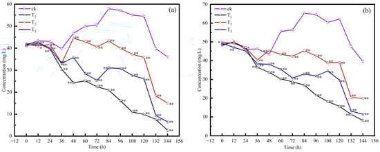 Effect of packing on removal rates of NO3−-N (a) and TN (b). T1: filler: magnetic pyrite: quartz sand = 1:1; T2: quartz sand; T3: magnetic pyrite. Statistically significant differences compared to the control group are indicated by * (p < 0.05) and ** (p < 0.01) in the graphs.